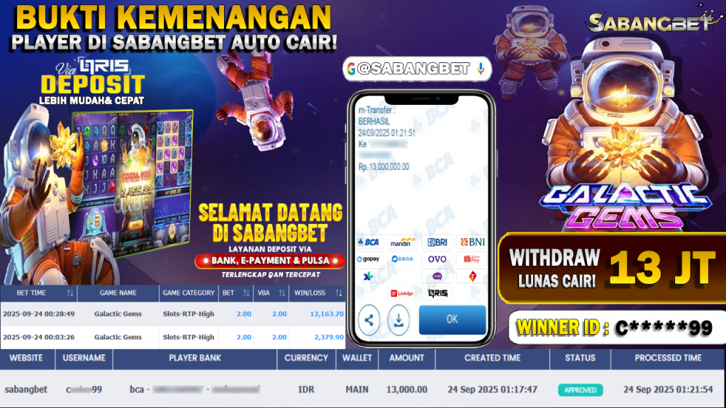 BUKTI KEMENANGAN 23 SEPTEMBER 2025 DI GAME GALACTIC GEMS WD 13 JUTA