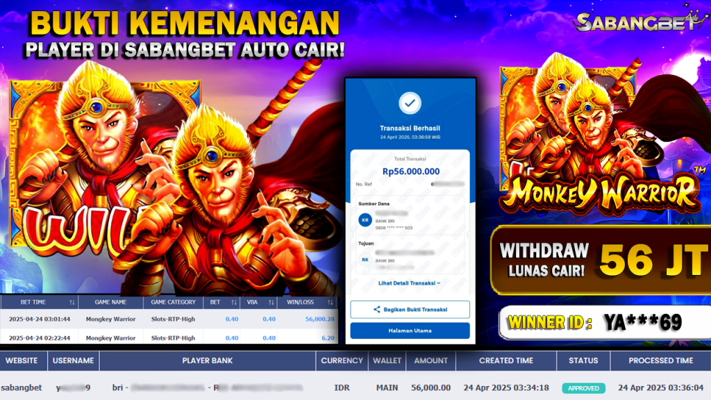 BUKTI KEMENANGAN 24 APRIL 2025 DI GAME MONGKEY WARRIOR WD 56 JUTA