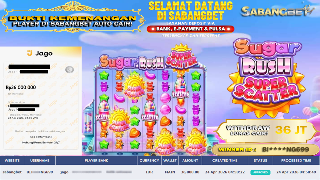BUKTI KEMENANGAN 24 APRIL 2026 DI GAME SUGAR RUSH SUPER SCATTER WD 36 JUTA