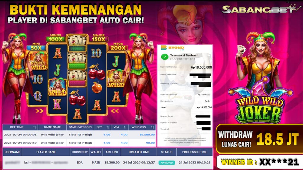 BUKTI KEMENANGAN 24 JULI 2025 DI GAME Wild Wild Joker WD 18.5 JUTA