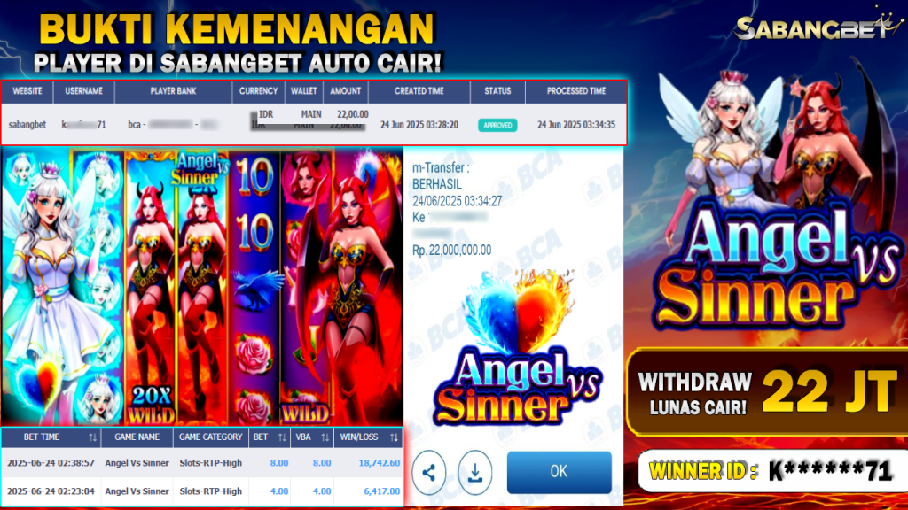 BUKTI KEMENANGAN 24 JUNI 2025 DI GAME ANGEL VS SINNER WD 22 JUTA