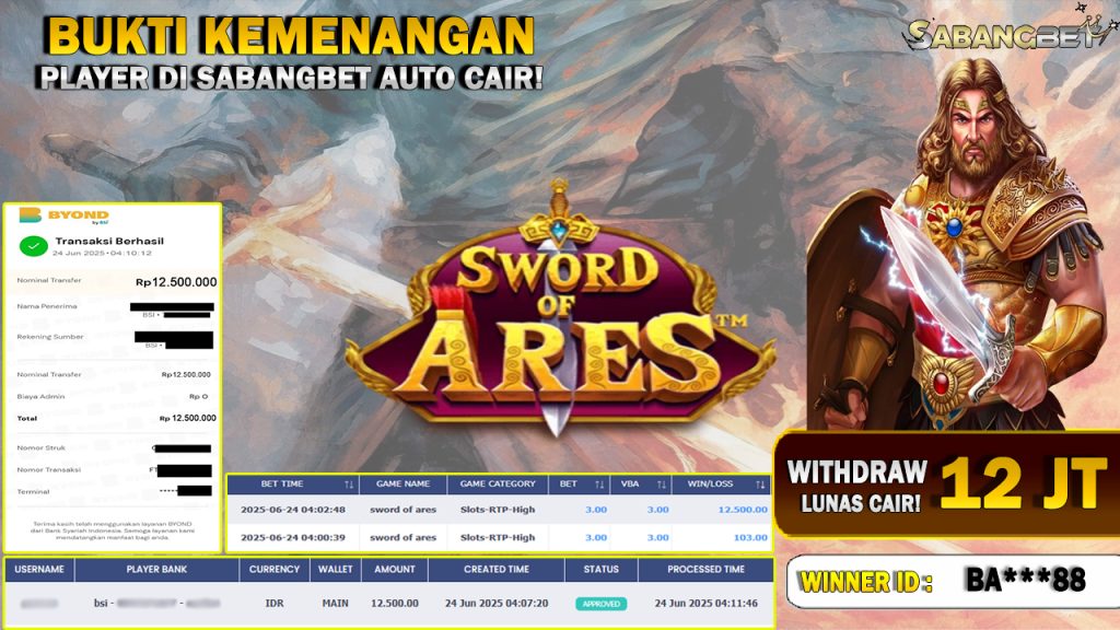 BUKTI KEMENANGAN 24 JUNI 2025 DI GAME sword of ares WD 12 JUTA