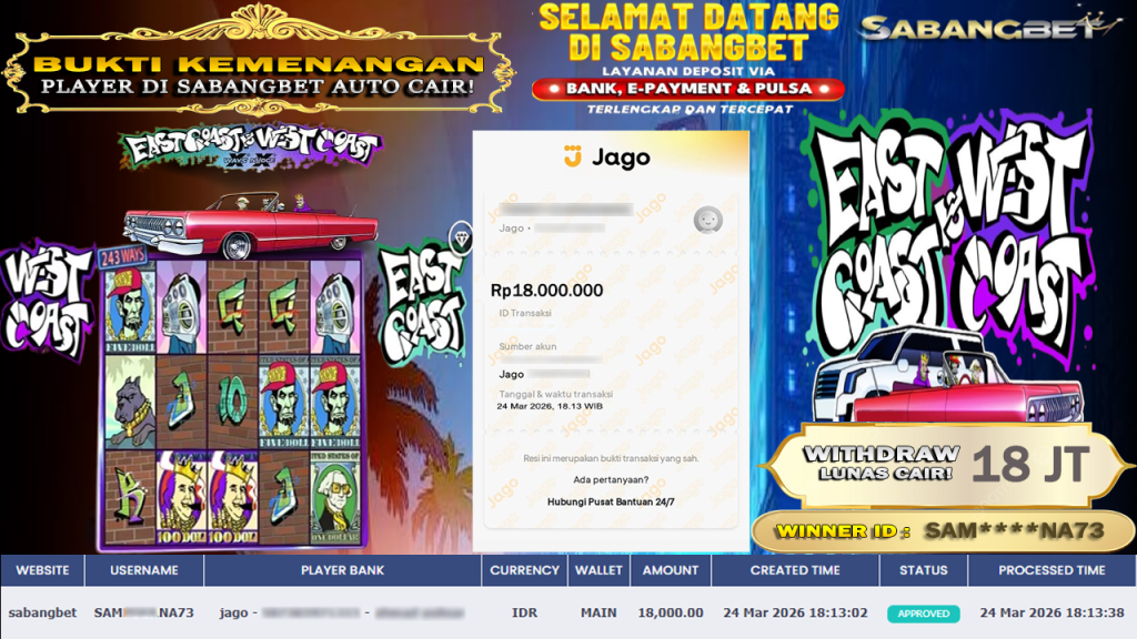 BUKTI KEMENANGAN 24 MARET 2026 DI GAME EAST COAST VS WEST COAST WD 18 JUTA