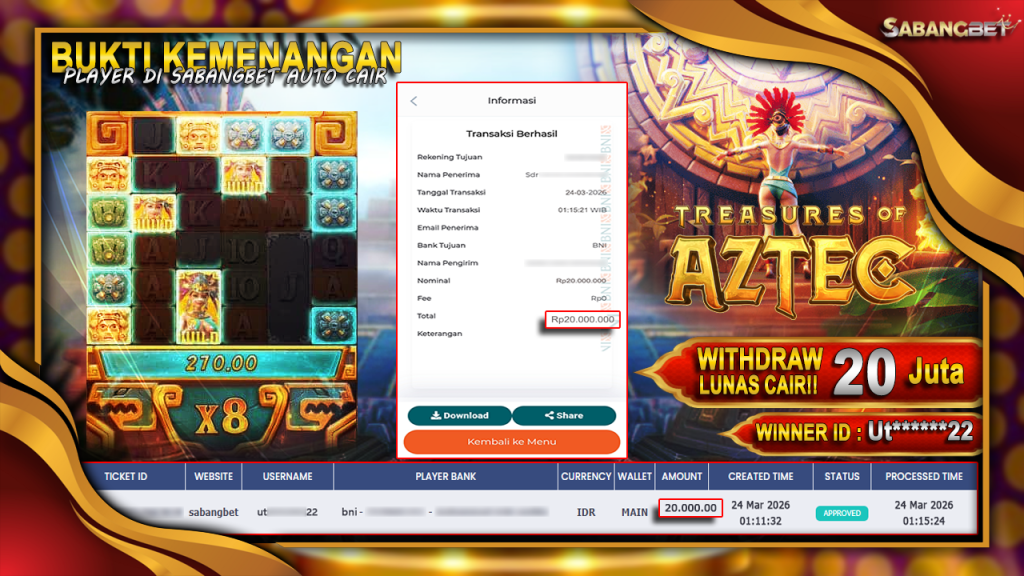 BUKTI KEMENANGAN 24 MARET 2026 DI GAME Treasures Aztec WD 20 JUTA