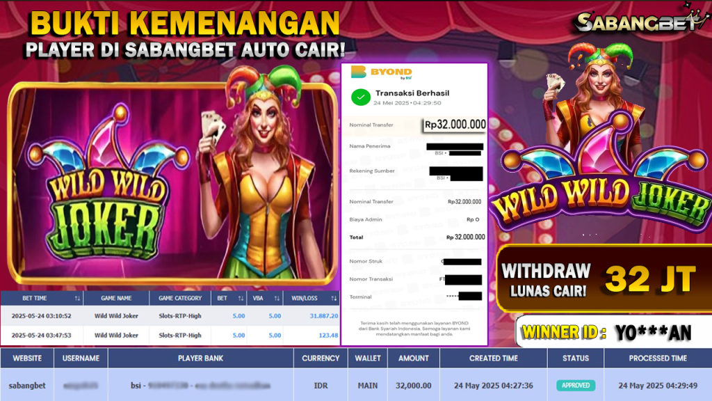 BUKTI KEMENANGAN 24 MEI 2025 DI GAME WILD WILD JOKER WD 32 JUTA