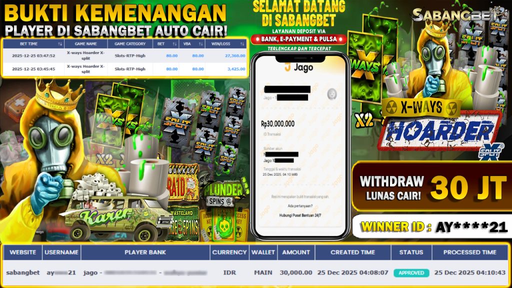 BUKTI KEMENANGAN 25 DESEMBER 2025 DI GAM1E X-WAYS HOARDER X-SPLIT WD 30 JUTA