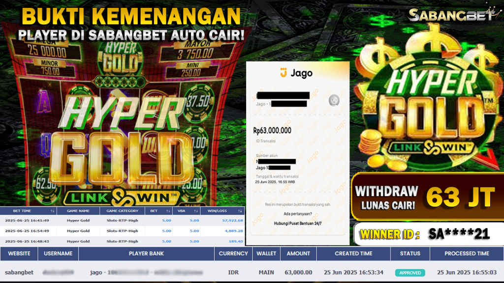 BUKTI KEMENANGAN 25 JUNI 2025 DI GAME HYPER GOLD WD 63 JUTA