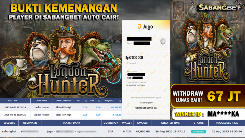 BUKTI KEMENANGAN 26 AGUSTUS 2025 DI GAME LONDON HUNTER WD 67 JUTA