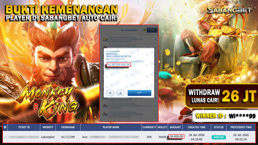 BUKTI KEMENANGAN 26 JANUARI 2026 DI GAME Legendary Monkey King WD 26 JUTA
