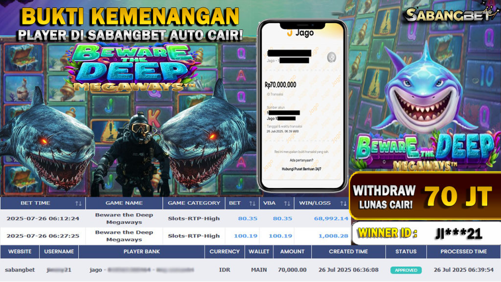 BUKTI KEMENANGAN 26 JULI 2025 DI GAME BEWARE THE DEEP MEGAWAYS WD 70 JUTA