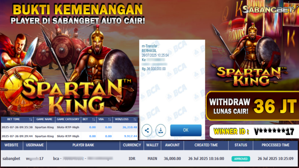BUKTI KEMENANGAN 26 JULI 2025 DI GAME SPARTAN KING WD 36 JUTA