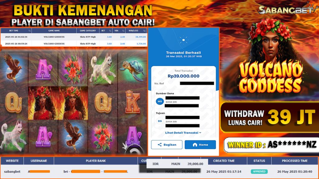 BUKTI KEMENANGAN 26 MEI 2025 DI GAME VOLCANO GODDESS WD 39 JUTA