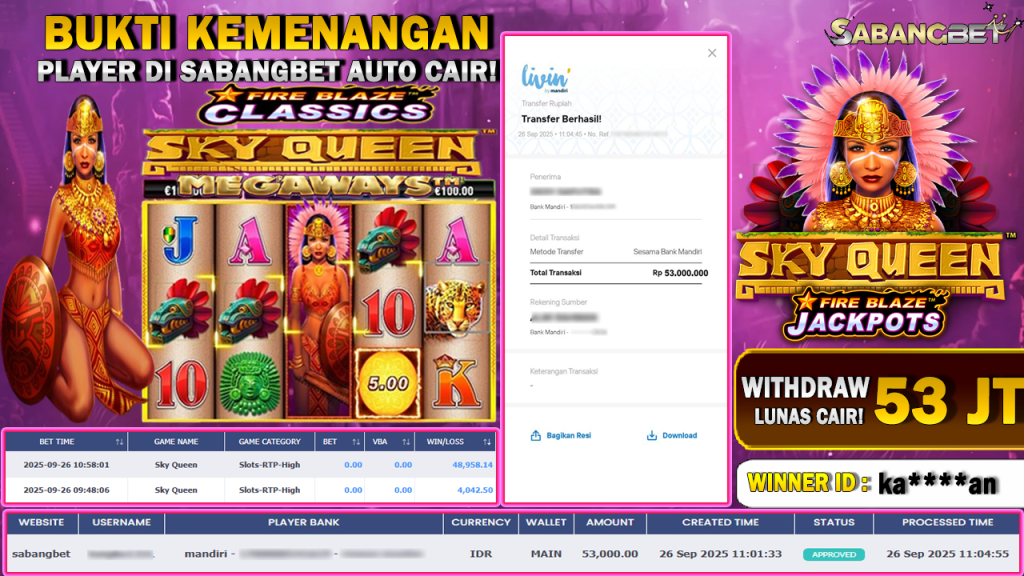 BUKTI KEMENANGAN 26 SEPTEMBER 2025 DI GAME SKY QUEEN WD 53 JUTA