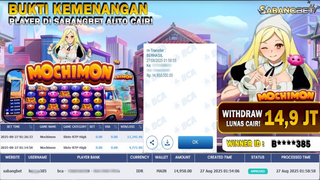BUKTI KEMENANGAN 27 AGUSTUS 2025 DI GAME MOCHIMON WD 14,9 JUTA