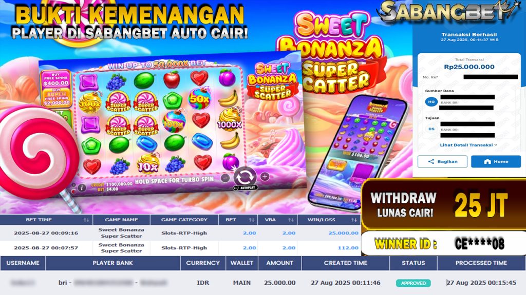 BUKTI KEMENANGAN 27 AGUSTUS 2025 DI GAME Sweet Bonanza Super Scatter WD 25 JUTA