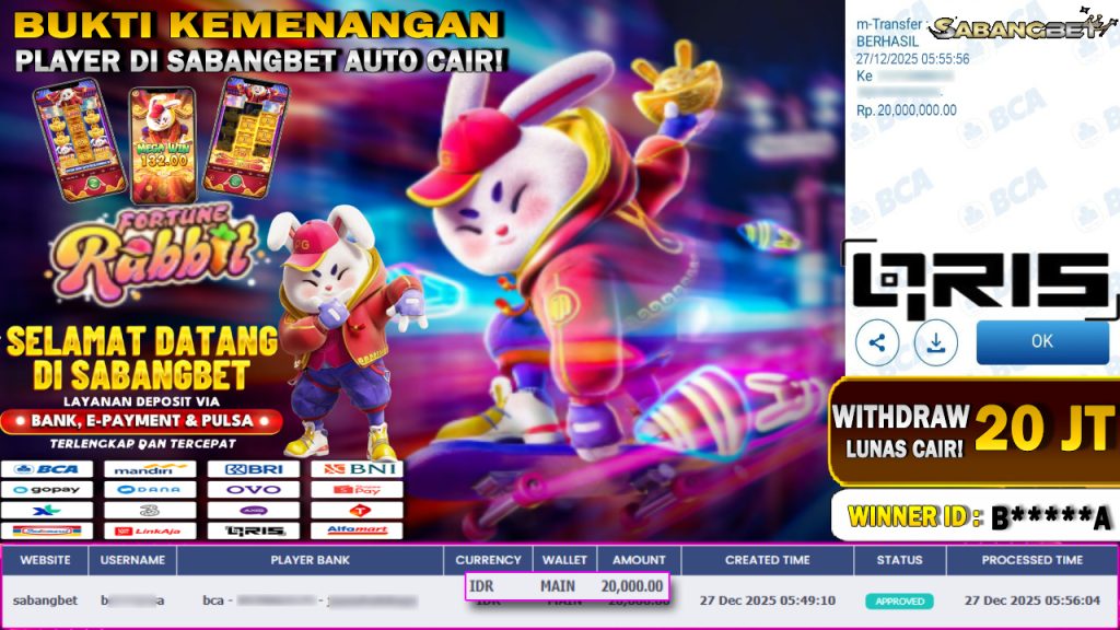 BUKTI KEMENANGAN 27 DESEMBER 2025 DI GAME FORTUNE RABBIT WD 20 JUTA