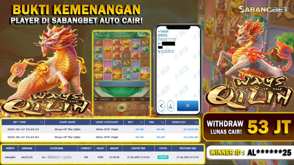 BUKTI KEMENANGAN 27 JUNI 2025 DI GAME WAYS OF THE QILIN WD 53 JUTA