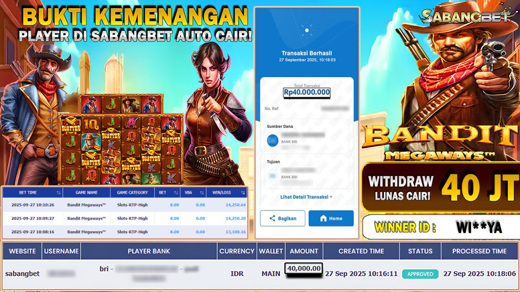 BUKTI KEMENANGAN 27 SEPTEMBER 2025 DI GAME BANDIT MEGAWAYS™ WD 40JUTA