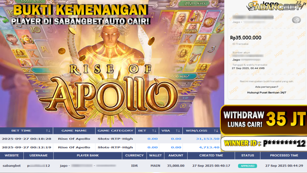 BUKTI KEMENANGAN 27 SEPTEMBER 2025 DI GAME RISE OF APOLLO WD 35 JUTA