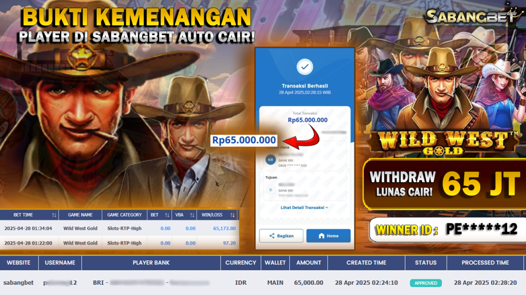 BUKTI KEMENANGAN 28 APRIL 2025 DI GAME WILD WEST GOLD WD 65 JUTA