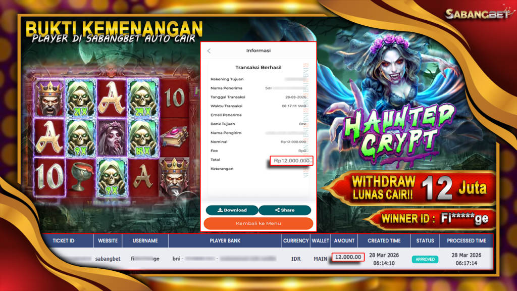 BUKTI KEMENANGAN 28 MARET 2026 DI GAME Haunted Crypt WD 12 JUTA