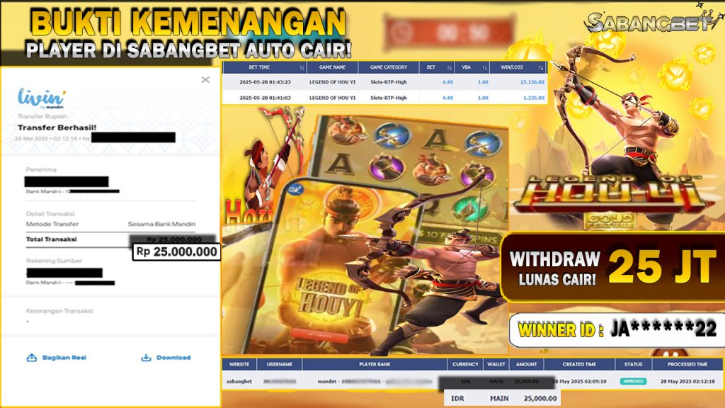 BUKTI KEMENANGAN 28 MEI 2025 DI GAME LEGEND OF HOU YI ‘PG SOFT’ WD 25 JT
