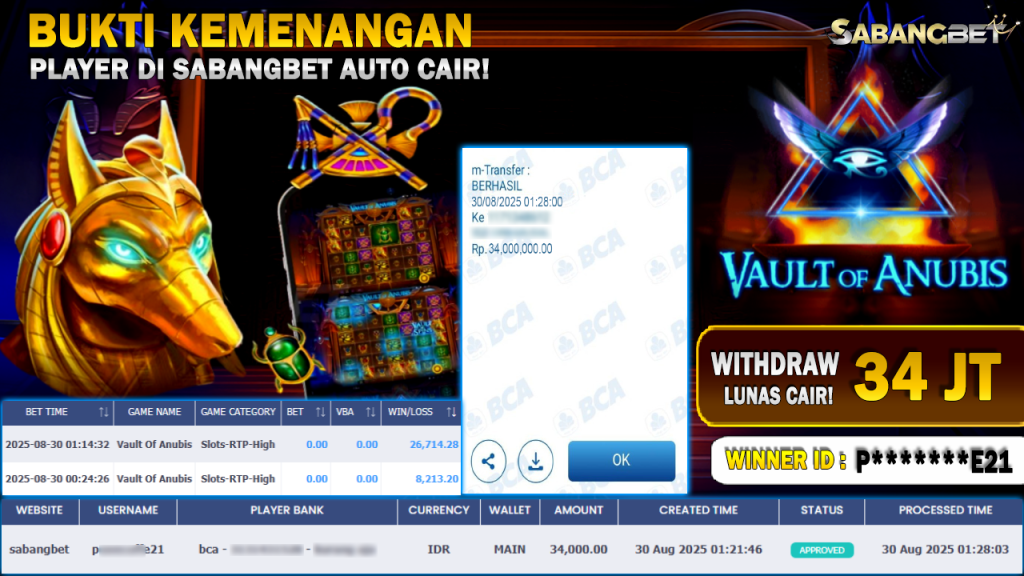 BUKTI KEMENANGAN 30 AGUSTUS 2025 DI GAME VAULT OF ANUBIS WD 34 JUTA