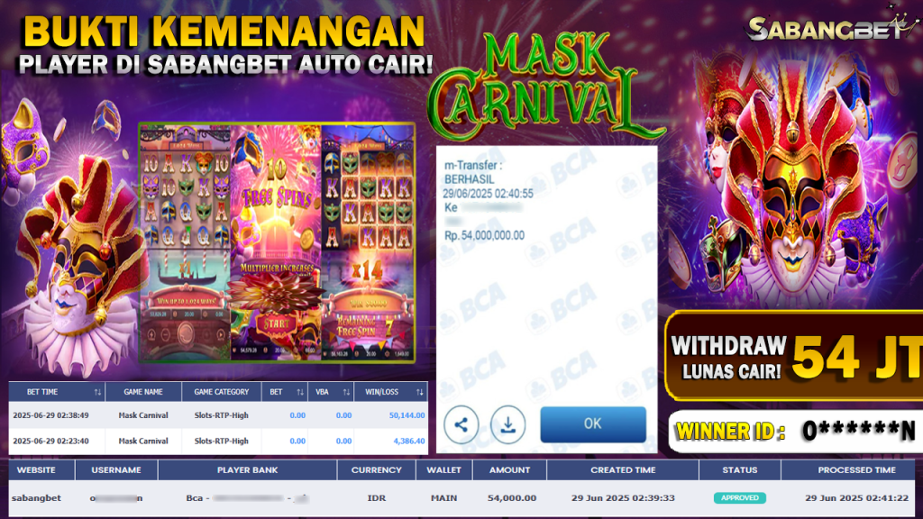 BUKTI KEMENANGAN 29 JUNI 2025 DI GAME MASK CARNIVAL WD 54 JUTA