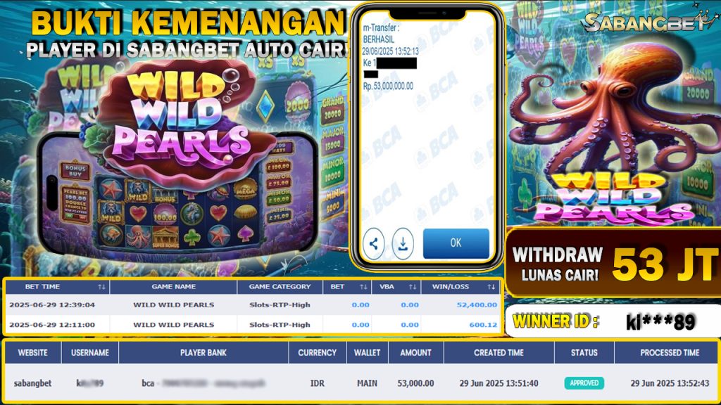 BUKTI KEMENANGAN 29 JUNI 2025 DI GAME WILD WILD PEARLS WD 53 JUTA