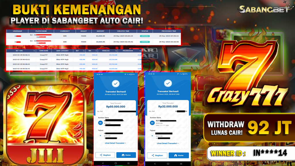 BUKTI KEMENANGAN 29 MARET 2025 DI GAME CRAZY 777 WD 92 JUTA