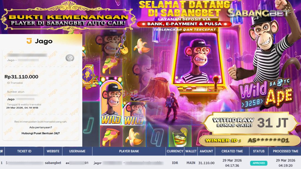 BUKTI KEMENANGAN 29 MARET 2026 DI GAME WILD APE WD 31 JUTA