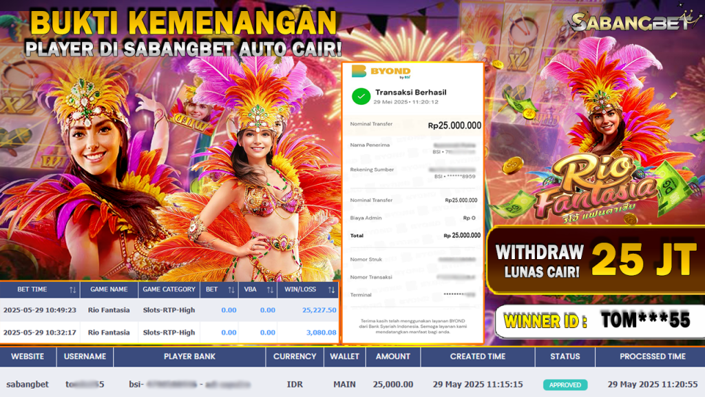 BUKTI KEMENANGAN 29 MEI 2025 DI GAME RIO FANTASIA ‘PG SOFT’ WD 25 JUTA