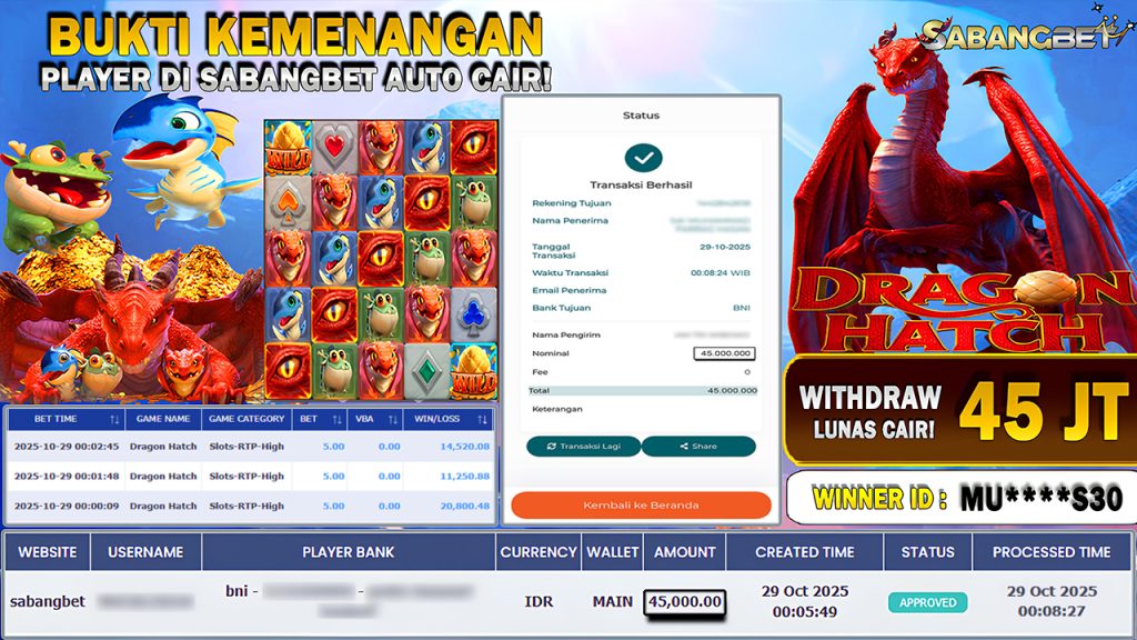 BUKTI KEMENANGAN 29 OKTOBER 2025 DI GAME DRAGON HATCH WD 45 JUTA