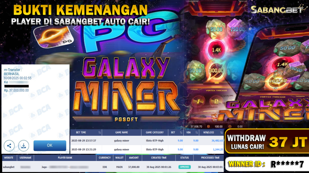BUKTI KEMENANGAN 30 AGUSTUS 2025 DI GAME GALAXY MINER ( POCKET GAME SOFT ) WD 37 JUTA