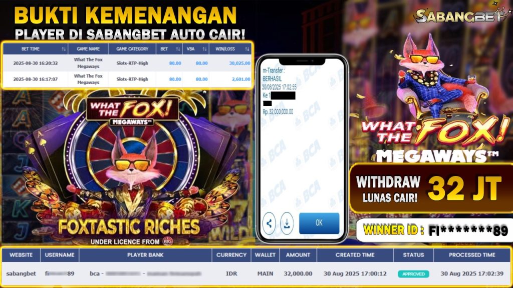 BUKTI KEMENANGAN 30 AGUSTUS 2025 DI GAME WHAT THE FOX MEGAWAYS WD 32 JUTA