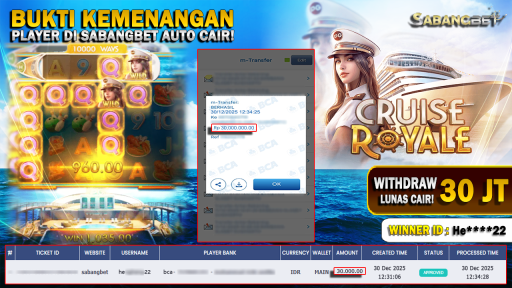 BUKTI KEMENANGAN 30 DESEMBER 2025 DI GAME Cruise Royale WD 30 JUTA