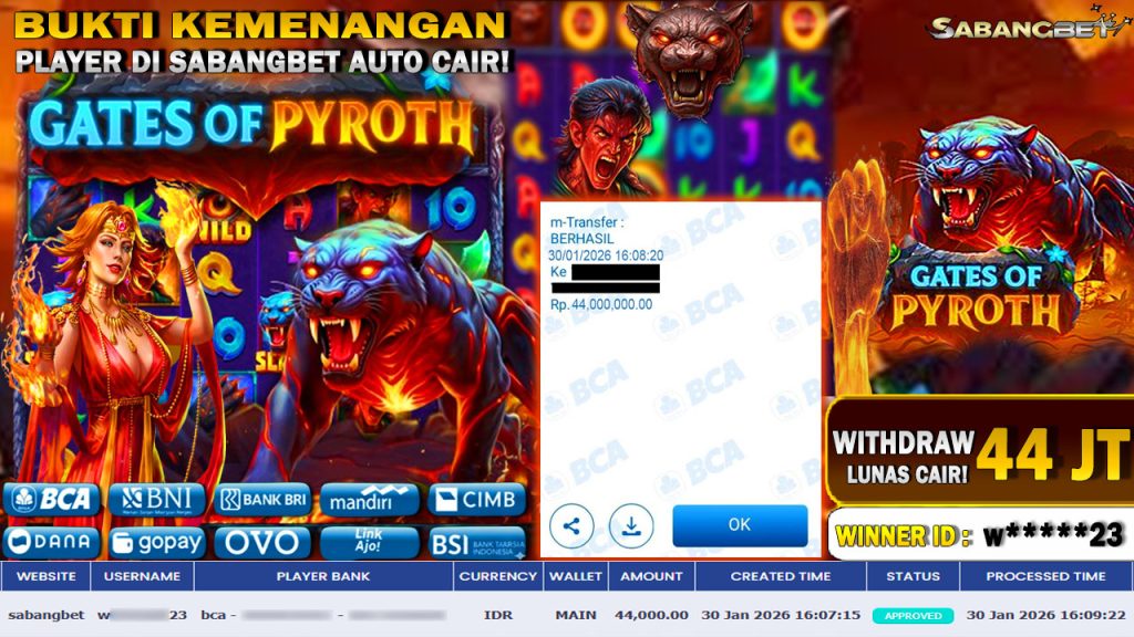 BUKTI KEMENANGAN 30 JANUARI 2026 DI GAME GATES OF PYROTH WD 44 JUTA