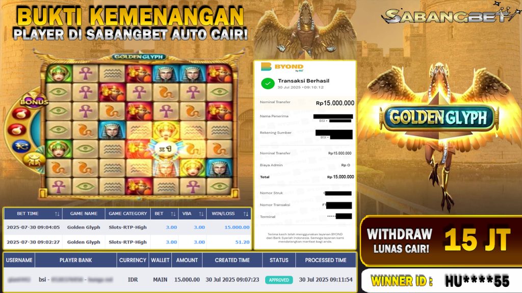BUKTI KEMENANGAN 30 JULI 2025 DI GAME Golden Glyph WD 15 JUTA