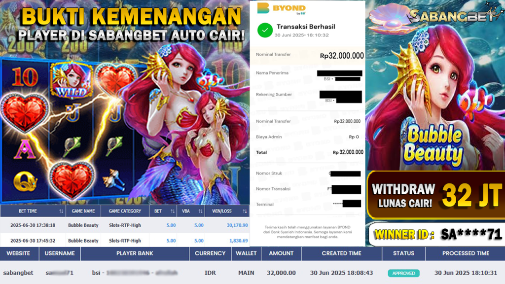 BUKTI KEMENANGAN 30 JUNI 2025 DI GAME BUBBLE BEAUTY WD 32 JUTA
