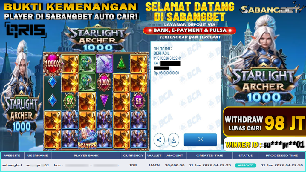 BUKTI KEMENANGAN 31 JANUARI 2026 DI GAME STARLIGHT ARCHER 1000 WD 98 JUTA