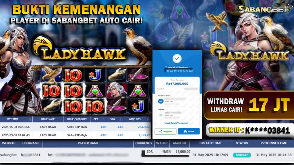 BUKTI KEMENANGAN 31 MEI 2025 DI GAME LADY HAWK WD 17 JUTA