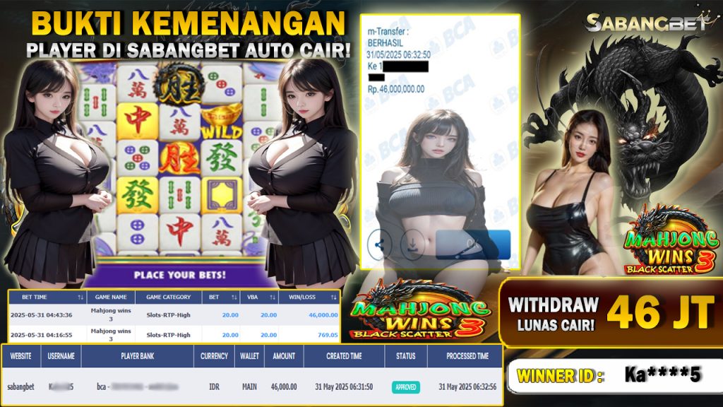 BUKTI KEMENANGAN 31 MEI 2025 DI GAME MAHJONG WINS 3 WD 46 JUTA
