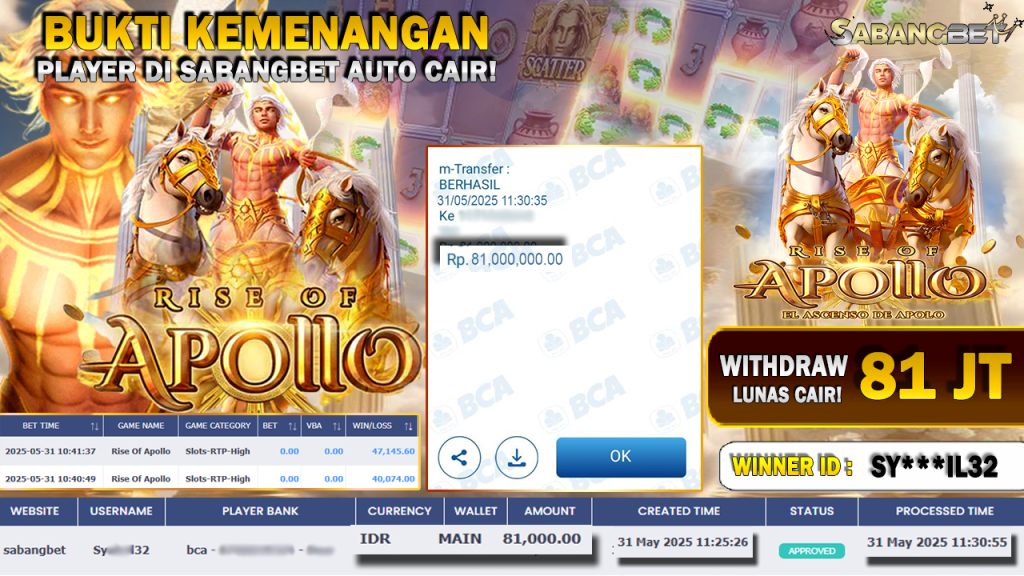BUKTI KEMENANGAN 31 MEI 2025 DI GAME RISE OF APOLLO ‘PG SOFT’ WD 81 JUTA