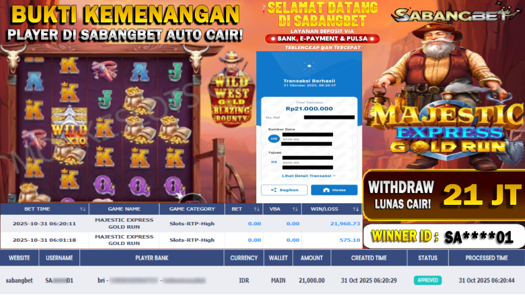 BUKTI KEMENANGAN 31 OKTOBER 2025 DI GAME MAJESTIC EXPRESS GOLD RUN WD 21 JUTA