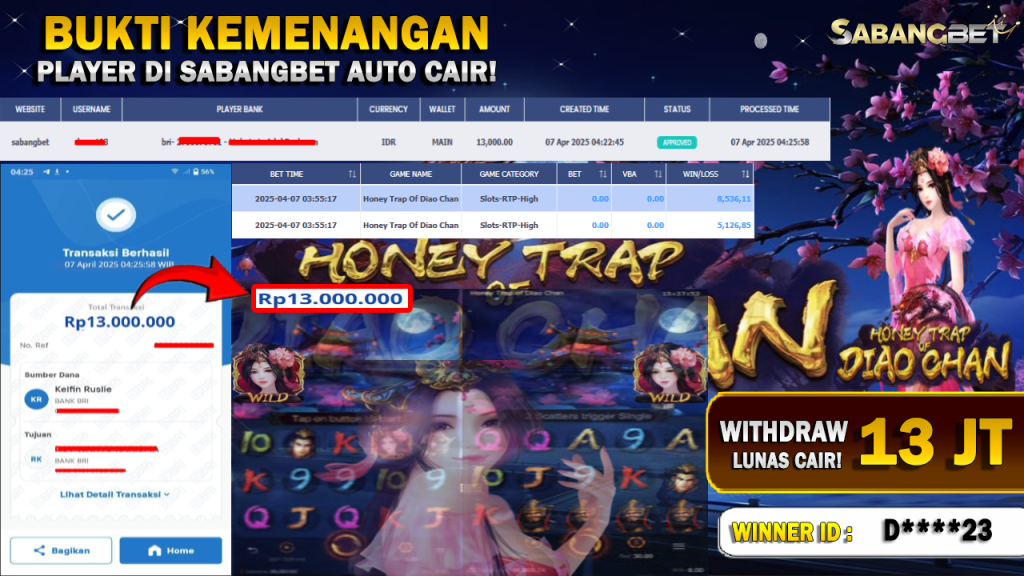BUKTI KEMENANGAN 7 APRIL 2025 DI GAME HONEY TRAP OF DIAO CHAN WD 13 JUTA