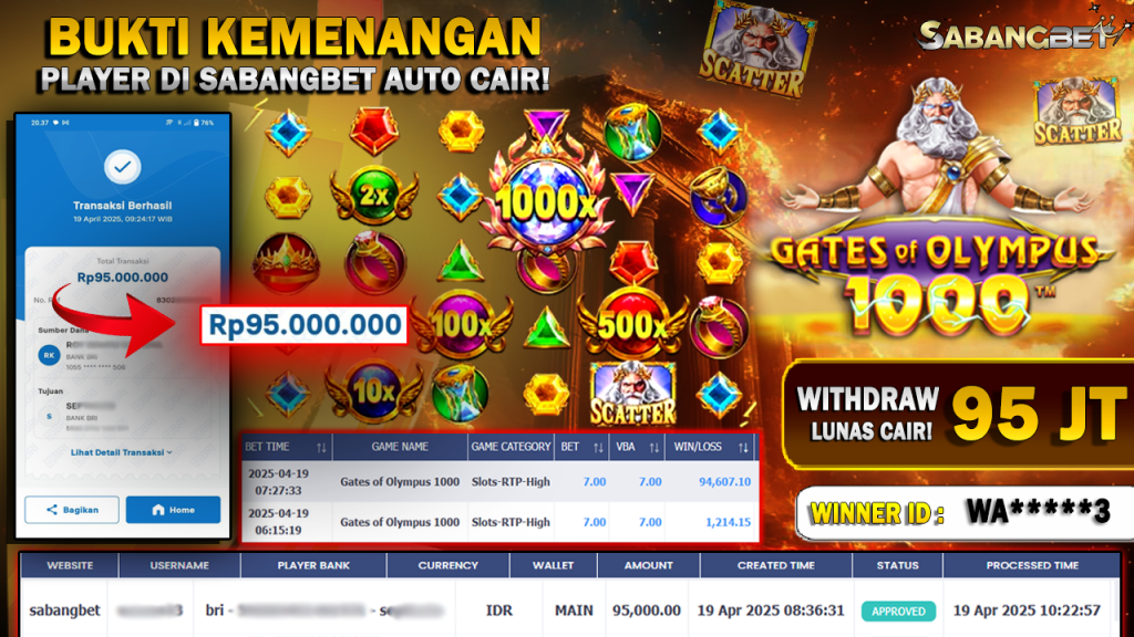 BUKTI KEMENANGAN 19 APRIL 2025 DI GAME GATES OF OLYMPUS 1000 WD 95 JUTA