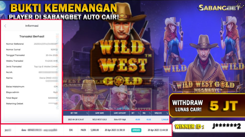 BUKTI KEMENANGAN 20 APRIL 2025 DI GAME WILD WEST GOLD WD 5 JUTA